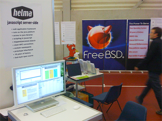 Last week I presented Helma at the OpenExpo in Zurich, where Helma and FreeBSD happened to be neighbors, which reminds me to point out that there is now a FreeBSD port of Helma thanks to decke's efforts.